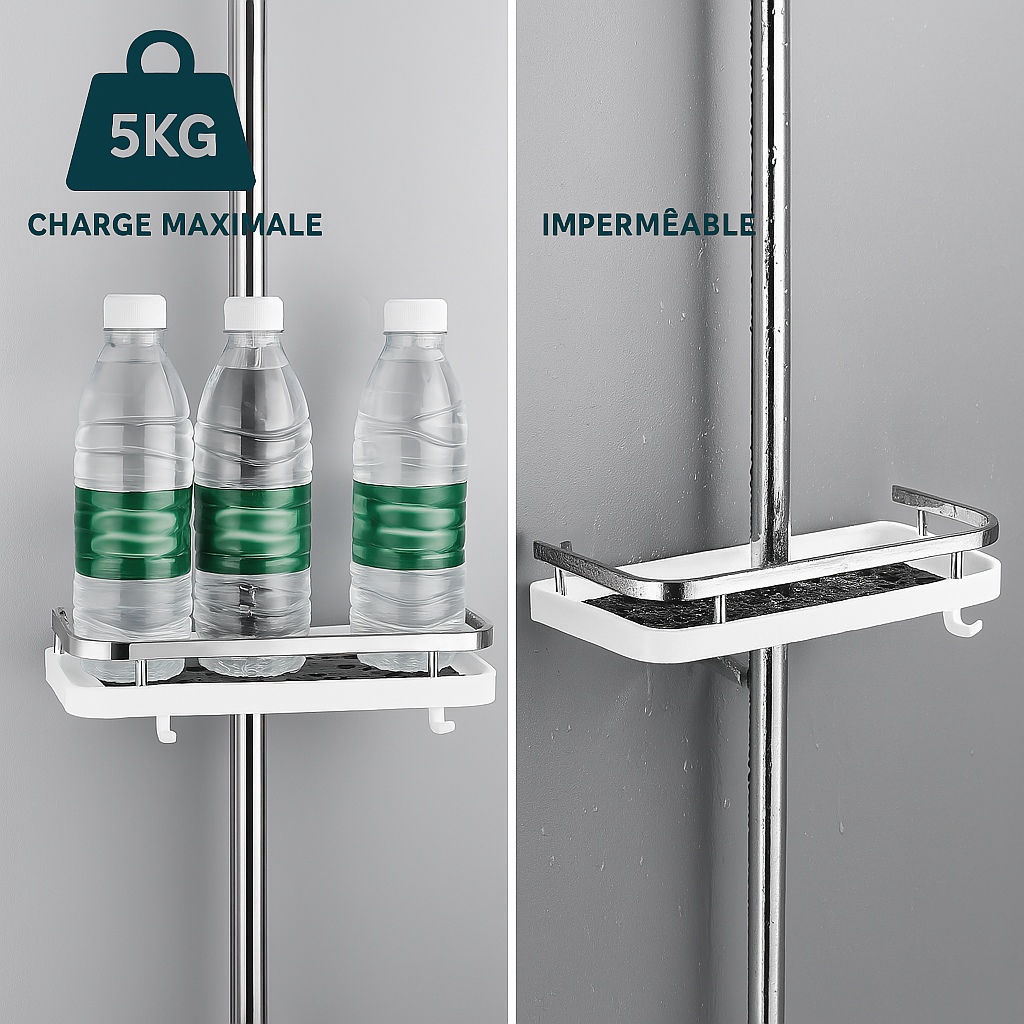 Fini le désordre ! Installez cette étagère sans perçage en quelques minutes. Elle se fixe directement sur la barre de douche, compatible avec toutes les barres standards.